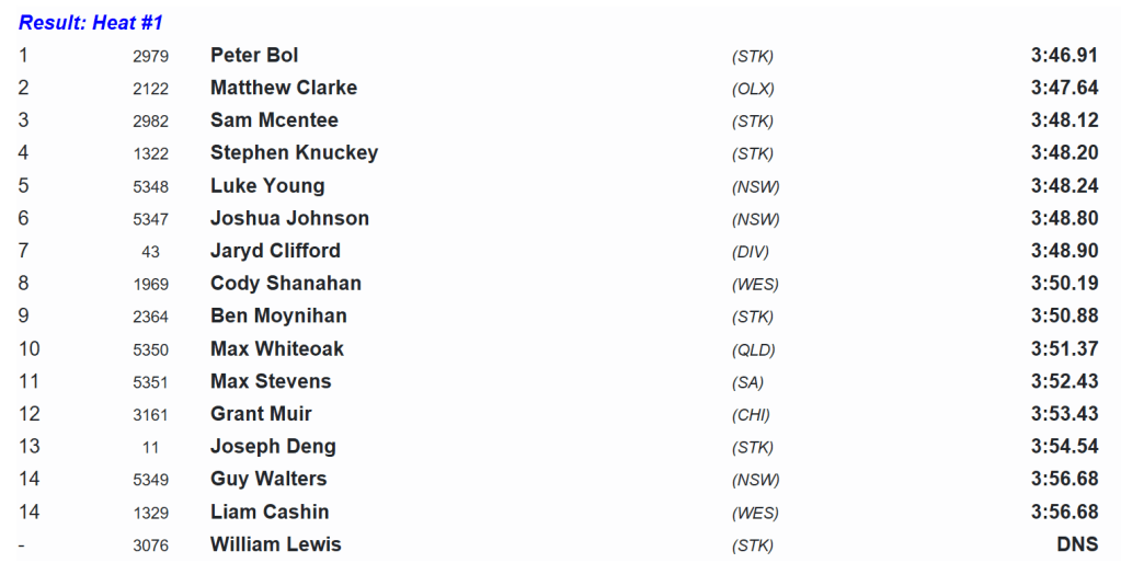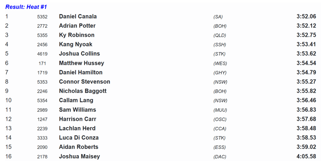 Canala and Potter would prove too strong in the run home, with Canala stopping the clock at 3:52.06 to secure the win ahead of Potter. They were followed in by Robinson, the fast-finishing Nyoak and a valiant Josh Collins.