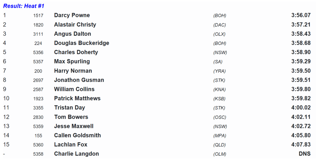 Powne floated down the home straight to beat all-comers in a dominant display and a time of 3:56.07, with Christy finishing off a terrific run for 2nd placing and Angus Dalton surfacing out of the group to pinch 3rd.