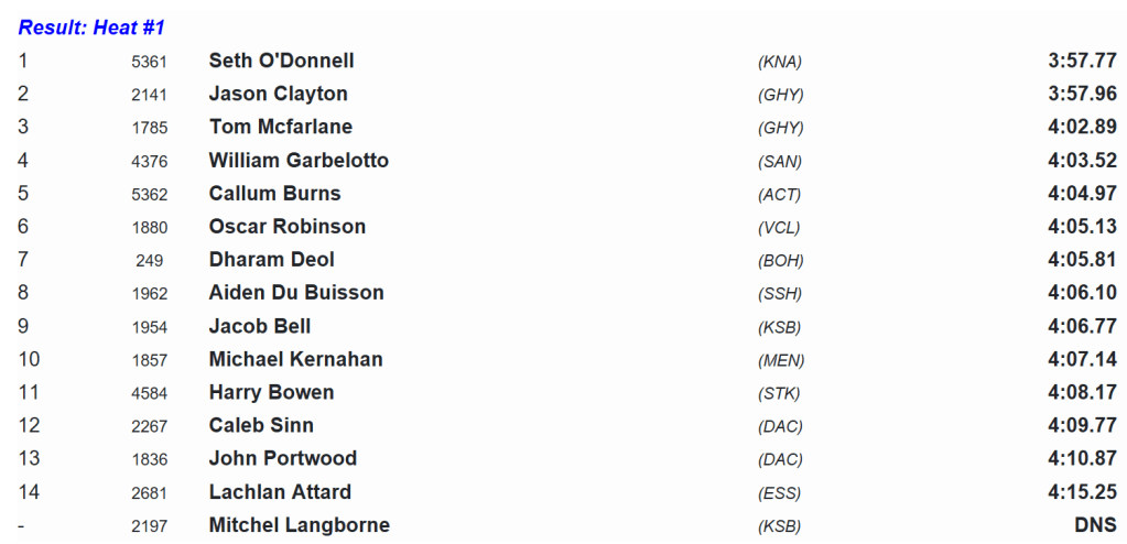 The pair ran 3:57.77 and 3:57.96 respectively, pretty outrageous for a ‘D’ heat of the Victorian Milers Club.