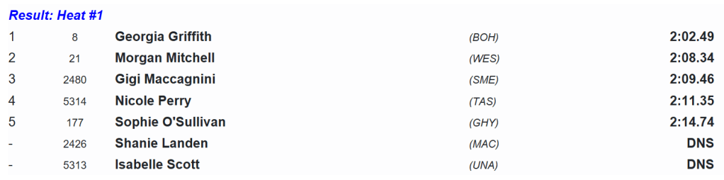 Shanie Landen was on pacing duties and had the field segregated early as she set an even tempo for 60 seconds through the bell with Griffith, Mitchell and Maccagnini all in contact.