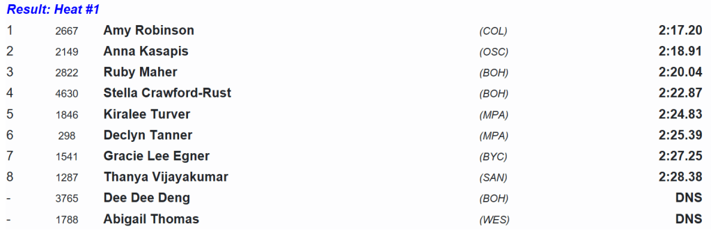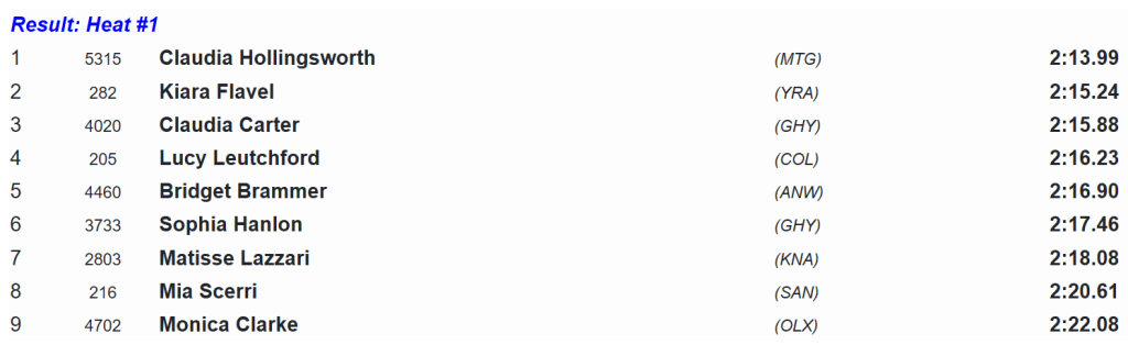 Hollingsworth was the first and last to go, effortlessly prancing her way to victory with seemingly ample left in the tank. She stopped the clock at 2:13.99.